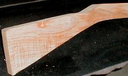| Curly Maple # 150 OAL: 59", Drop: 2 1/2", Thickness 2 3/8", Butt height: 5 1/2" Up to a 42" barrel Has some curl in the butt and quite a bit up through the forestock. SOLD |