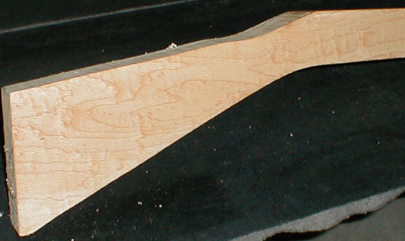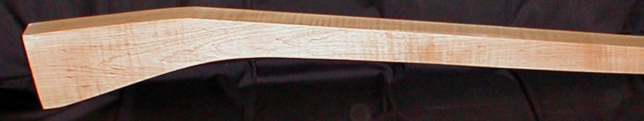| Curly Maple # 97 OAL: 59", Drop: 2 1/4", Thickness 2 3/8", Butt height: 5 1/2" Up to a 42" barrel SOLD |